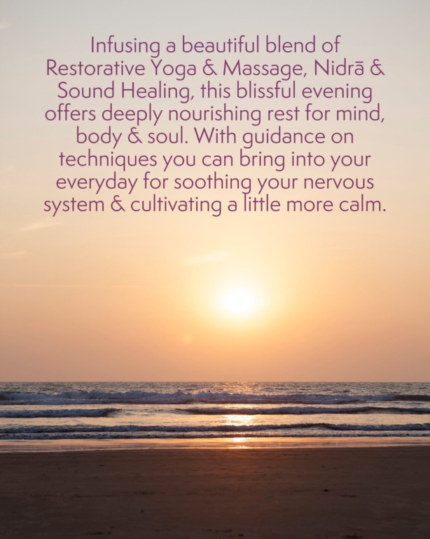 Infusing a beautiful blend of Restorative Yoga & Massage, Nidrā & Sound Healing, this blissful evening offers deeply nourishing rest for mind, body & soul. With guidance on techniques you can bring into your everyday for soothing your nervous system & cultivating a little more calm.