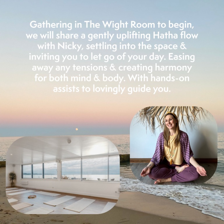 Gathering in The Wight Room to begin, we will share a gently uplifting Hatha flow with Nicky to begin, settling into the space & inviting you to let go of your day. Easing away any tensions & creating harmony for both mind & body. With hands-on assists to lovingly guide you.