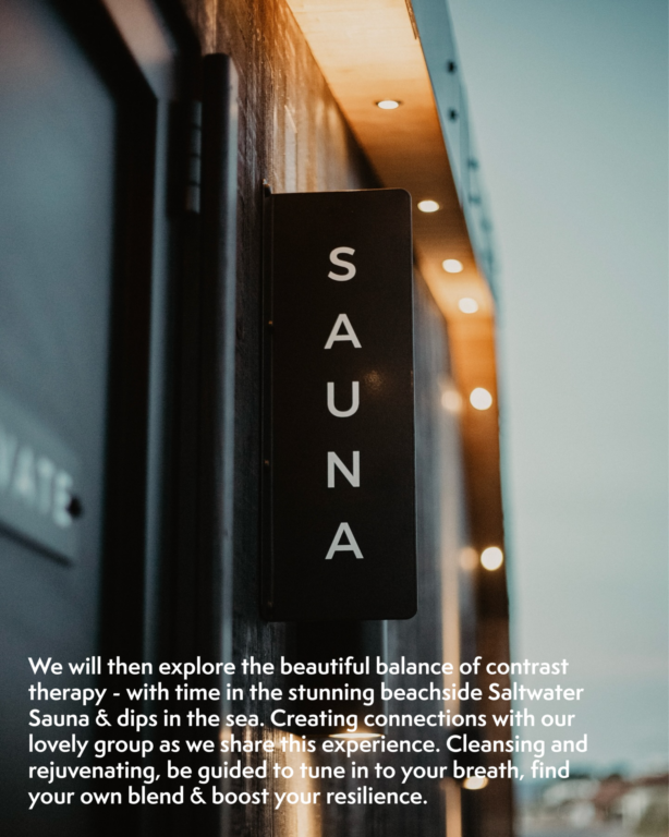 We will then explore the beautiful balance of contrast therapy – with time in the stunning beachside Saltwater Sauna & dips in the sea. Creating connections with our lovely group as we share this experience. Cleansing and rejuvenating, be guided to tune in to your breath, find your own blend & boost your resilience.Â
